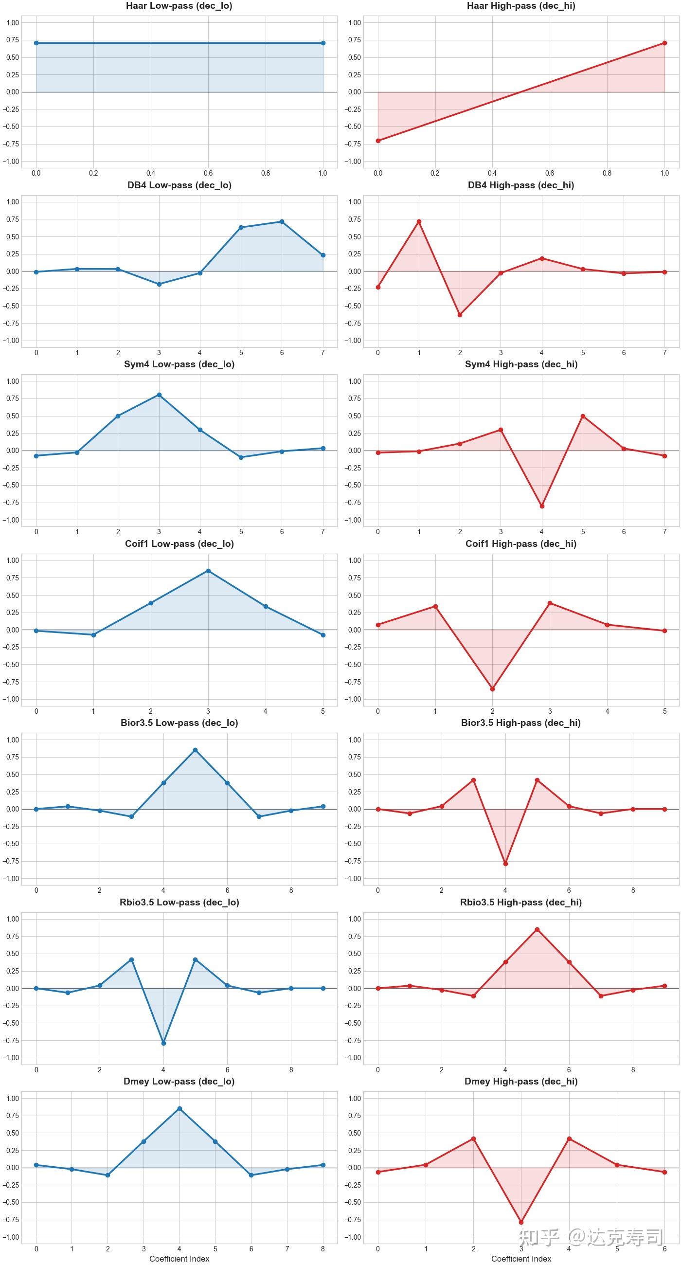 First, what is the actual difference between wavelet types? In discrete wavelet transform, wavelets are generally divided into orthogonal wavelets and non-/biorthogonal wavelets. Orthogonal wavelets use the same wavelet pair for both decomposition and reconstruction, while non-orthogonal (or biorthogonal) wavelets use different pairs for decomposition and reconstruction. According to the pywt documentation, orthogonal families include haar, Daubechies, sym, coif, and demy; non-orthogonal families include rbio and bior.