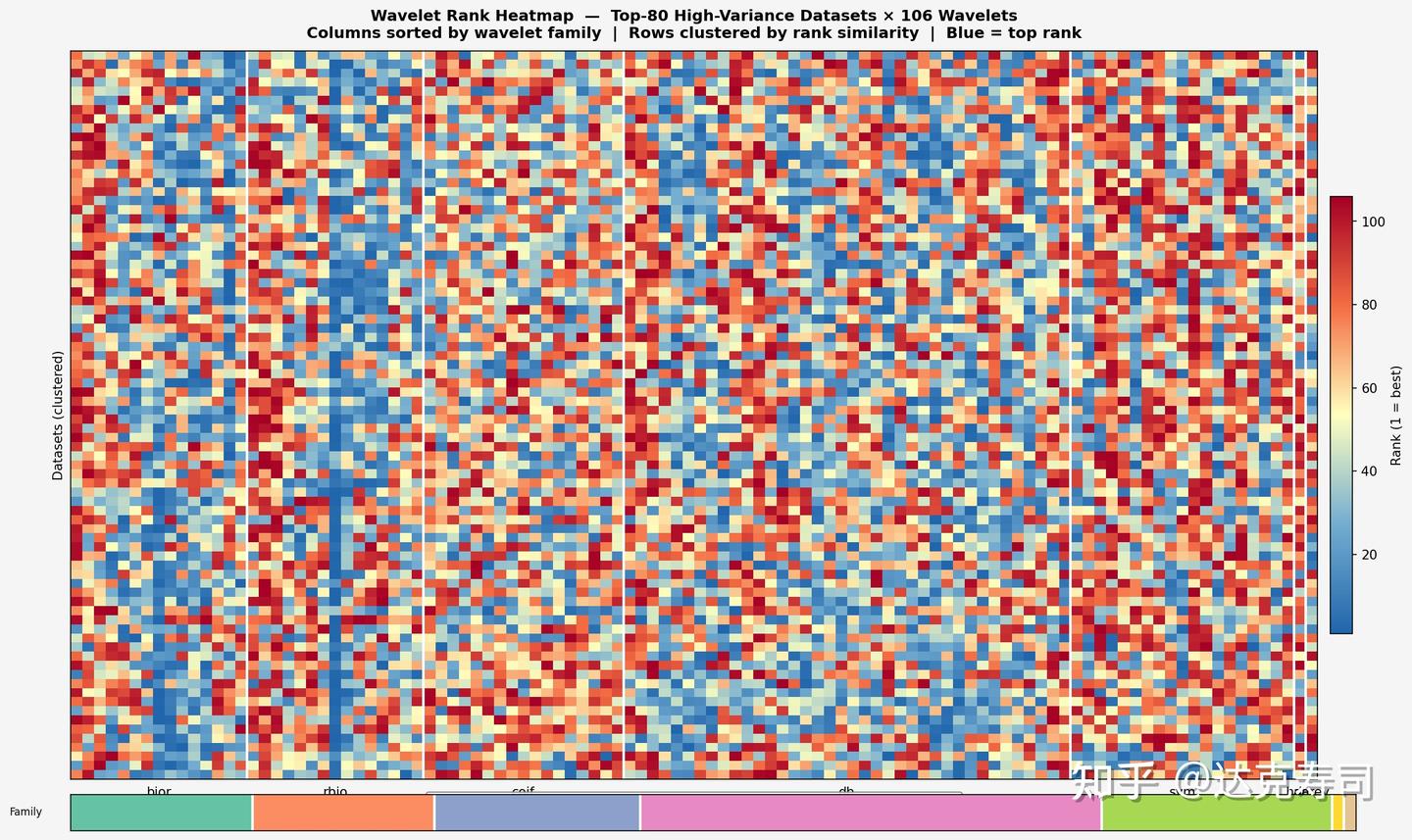 In the figure above, each pixel represents model performance for one dataset-wavelet pair: red is the lowest rank and blue is the highest. The y-axis is datasets, the x-axis is wavelets, and wavelet families are color-grouped as bior, rbio, coif, db, sym, haar, and demy.