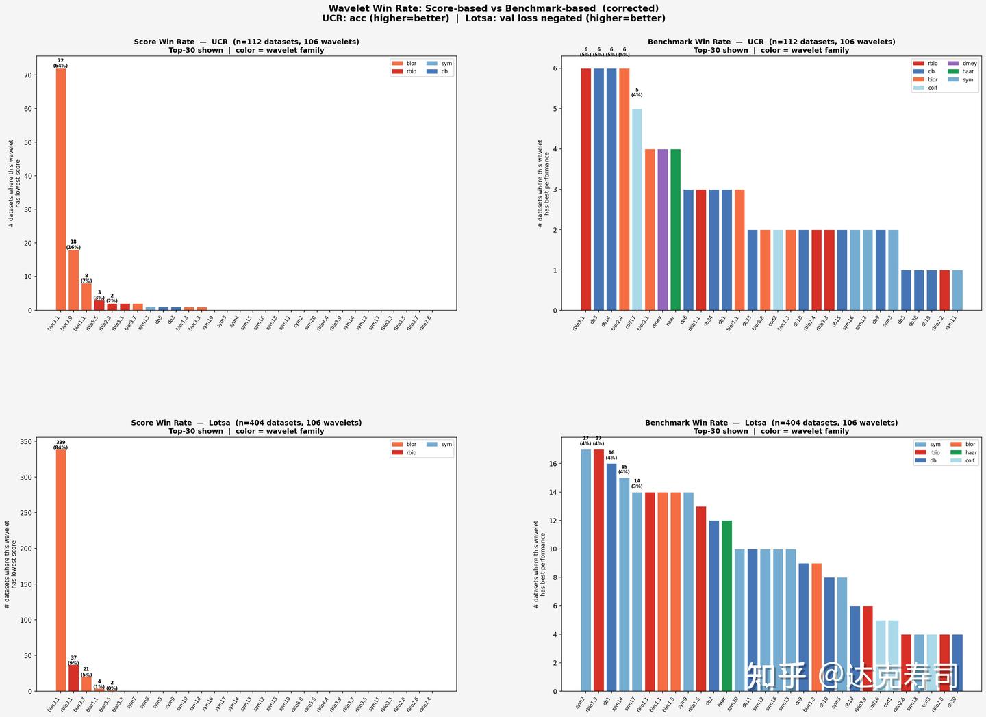 As we can see, almost no wavelet dominates across all datasets. However, the rbio family clearly contains more high-ranking wavelets (larger blue proportion), followed by bior and db. This suggests biorthogonal wavelets are particularly suitable for time-series modeling. Among orthogonal families, db performs relatively well but with larger variance; other orthogonal families generally trail db. In practice, for time-series tasks (both regression and classification), rbio is often a strong first choice, and one medium-length rbio wavelet appears broadly effective across datasets.