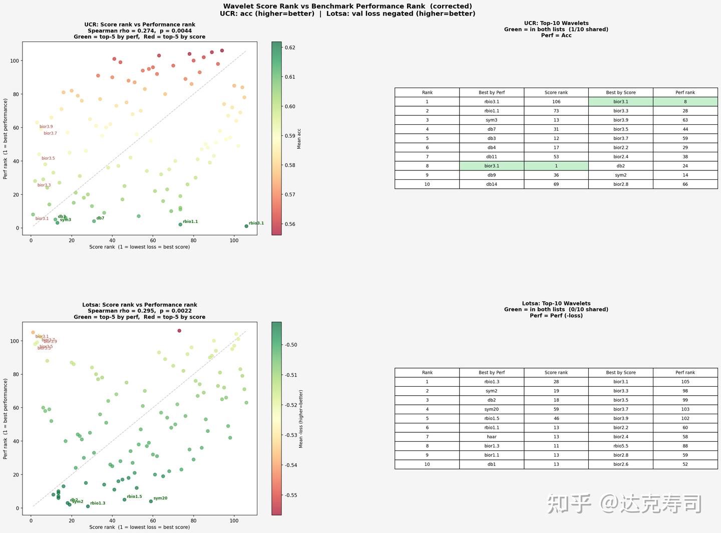 The next question is whether earlier evaluation metrics (sparsity, energy concentration, etc.) can actually reflect real performance. If they can, researchers could select wavelets by metric computation instead of running many full experiments, saving significant time. With that in mind, we compare metric-based ranking and true performance ranking below: