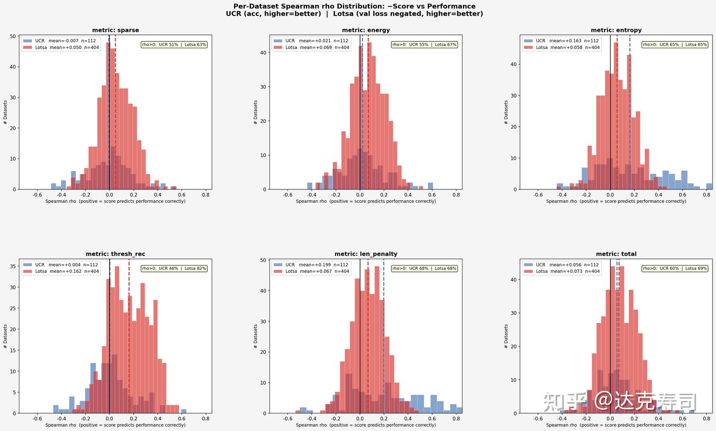 Overall, the relationship is positively correlated. UCR appears relatively self-consistent: wavelets with strongest true performance also tend to align with better metric values (concentrated near the lower-left region). LOTSA shows some extreme cases, where certain high-performing wavelets appear in the upper-left region, suggesting that for LOTSA (forecasting tasks), wavelets with poor metric scores can still perform strongly in practice. Next, let’s inspect correlation by individual metric: